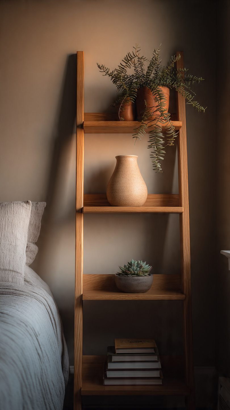 A ladder shelf leans against the wall, using vertical space without floor clutter. Style it with three items max per shelf: books, a small plant, and one ceramic piece. Keep the top shelf empty to reduce visual weight and maintain calm.