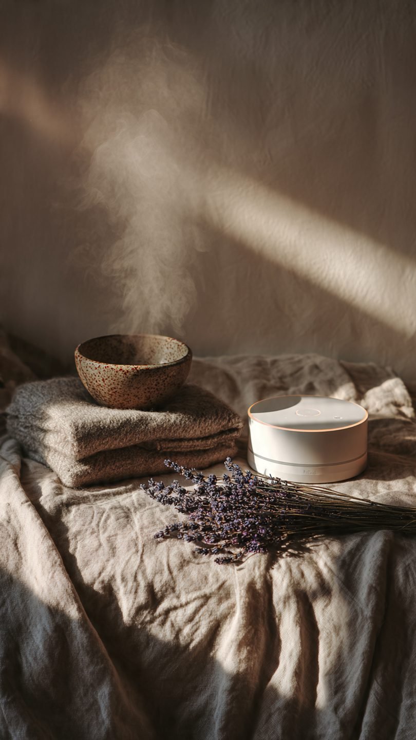 Sensory cozy kit for small bedrooms: essential oil diffuser, white noise machine, and heated throw to engage scent, sound, and touch.