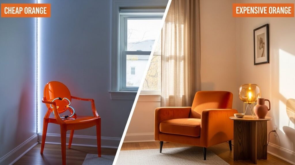Also, limit reflective surfaces. Glossy orange furniture can look dated; opt for brushed metal finishes (brass, bronze) instead of chrome.